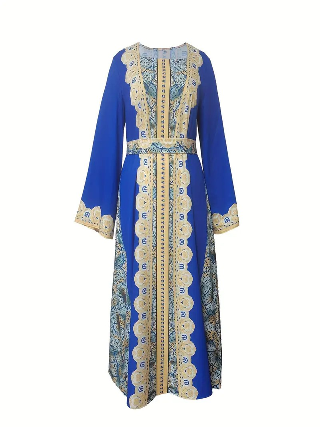 1pc Elegant Middle Eastern Tribal Print Kaftan Dress - Polyester Long Sleeve Square Neck with Belt Detail, Fitted A-Line Silhouette for Spring/Summer/Fall
