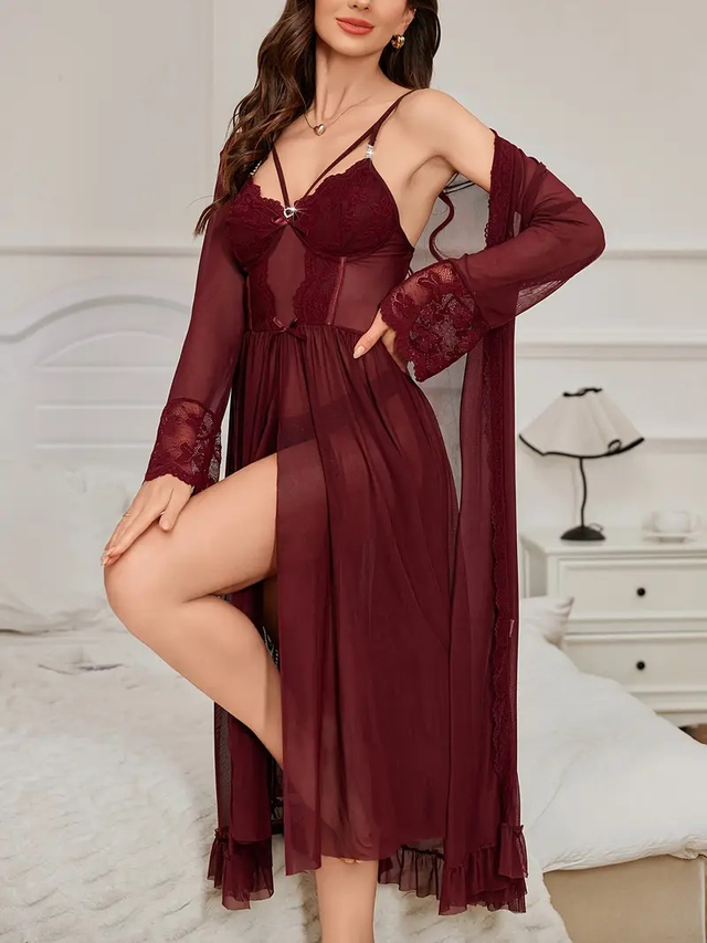 3pcs pajama set, mature Women's V-neck pajama with contrasting lace details, hollowed out V-neck backless side slit mid length camisole dress, suitable for all seasons, solid color pajama with belt