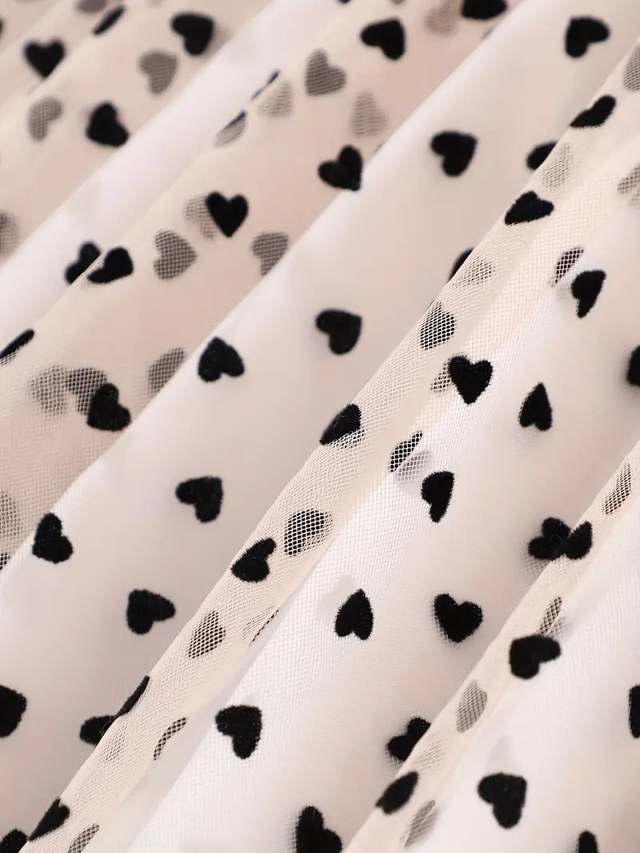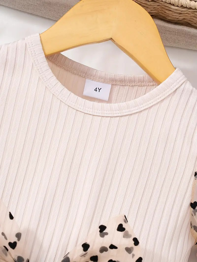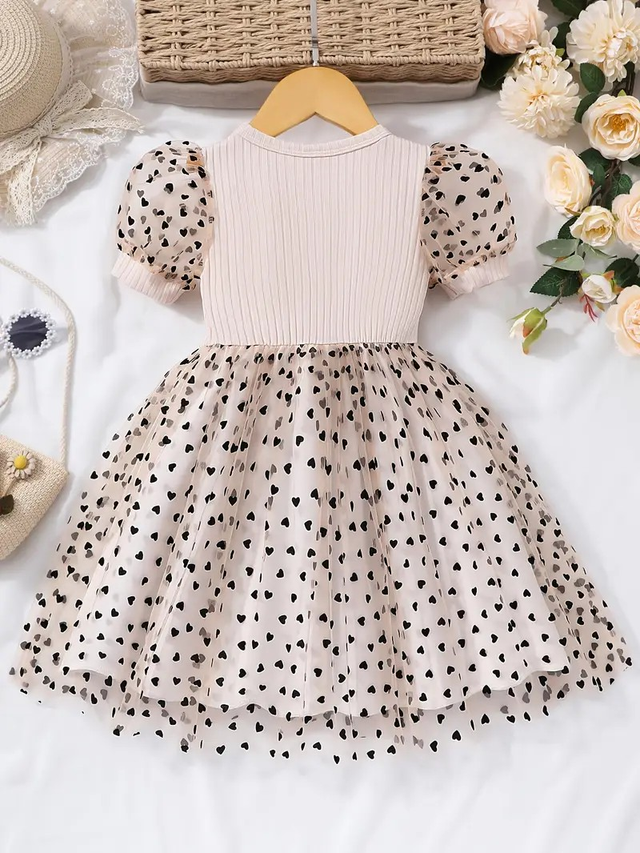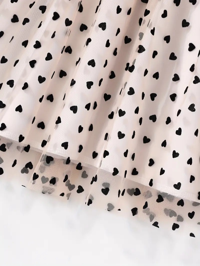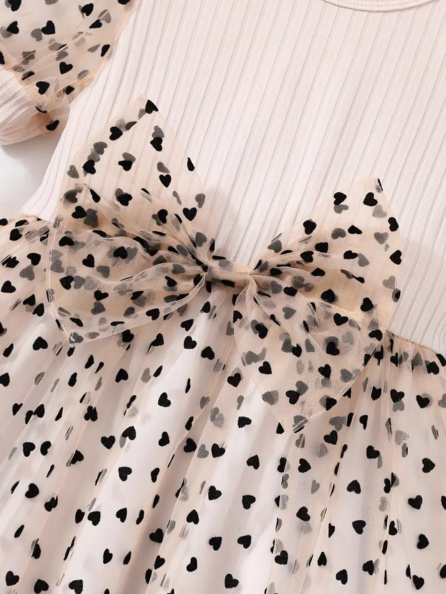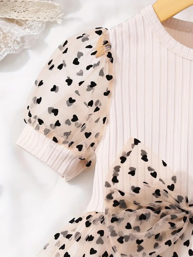 A knitted top with polka dot mesh skirt, the summer puffy skirt hem is super lively, decorated with a big bow, and the sweet and retro puffed sleeves are cute and sweet polka dots that little girls love