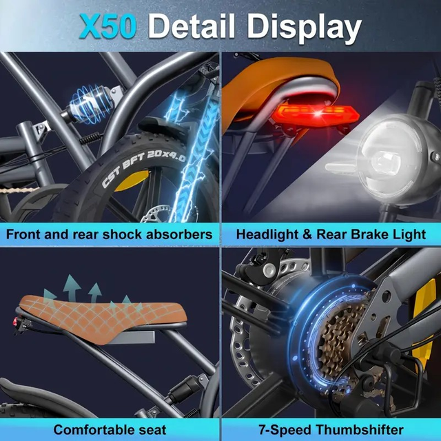 Adult Electric Bike 50.8cm x4.0 Tire with 250W Brushless Motor, 48V 14Ah Removable Battery, 7-Speed Gears, 15 MPH Top Speed, Front Headlight & Disc Brakes - Urban Commuter & Mountain Bike for Outdoor Sports, Camping, Holiday Gifts (Grey), Electric Bike for Adults