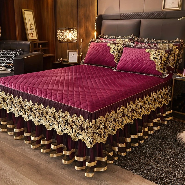 3pcs Solid Color Skin-Friendly Bed Skirt Set With Lace Detail (1 Bed Skirt + 2 Pillowcases), Quilted Layered Design, Elegant Ruffled Accents, Moisture-Wicking Mattress Cover With Ties, Easy