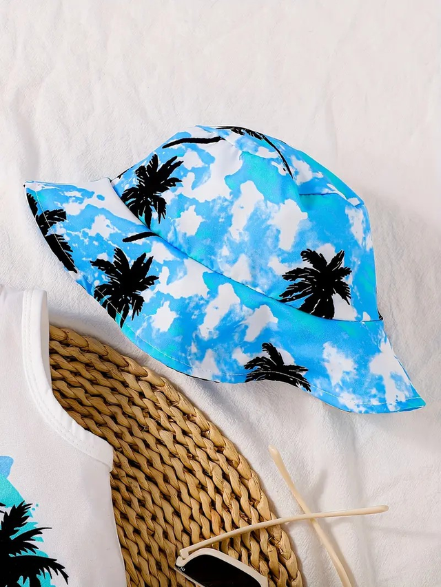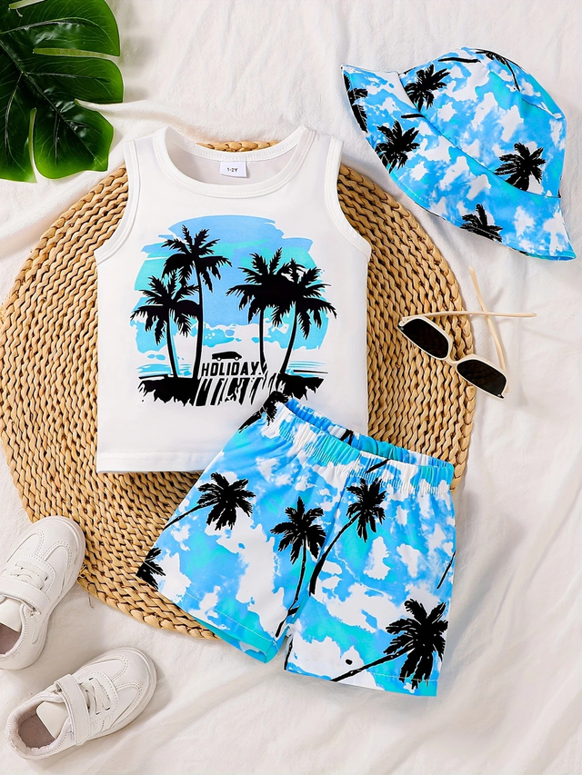 3pcs Set of Young Boys' Casual Tropical Rainforest Coconut Tree Print Sleeveless Top, Shorts, and Hat Outfit Suitable for Summer Vacation, Perfect for Outdoor