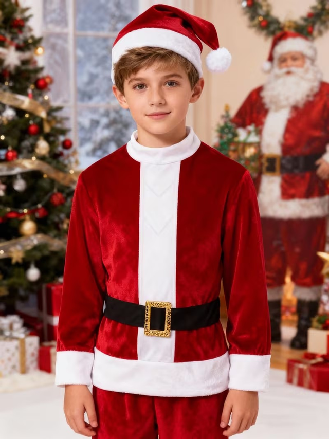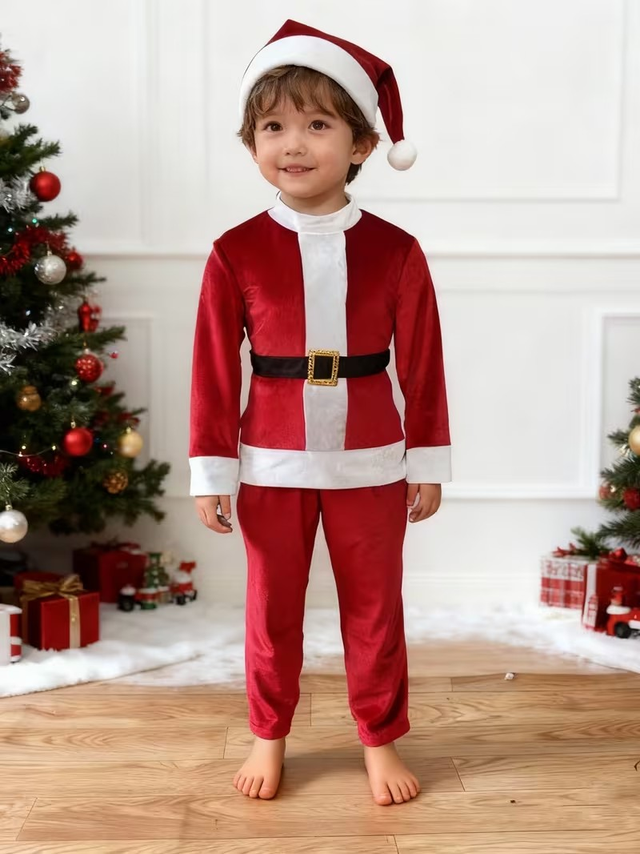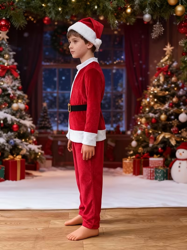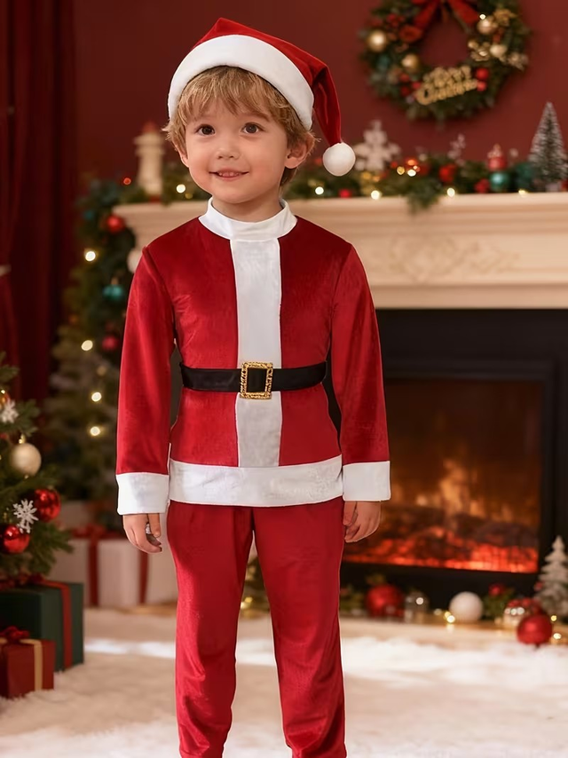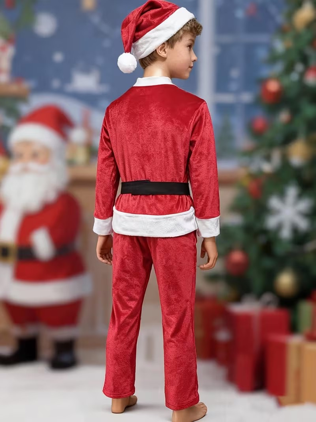 Boys' Christmas Velvet Hat, Jacket, Pants, Belt Set | Stand Collar, Color Block, Medium Stretch Fabric, All-Season, Skinny Fit.