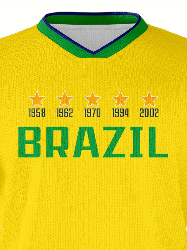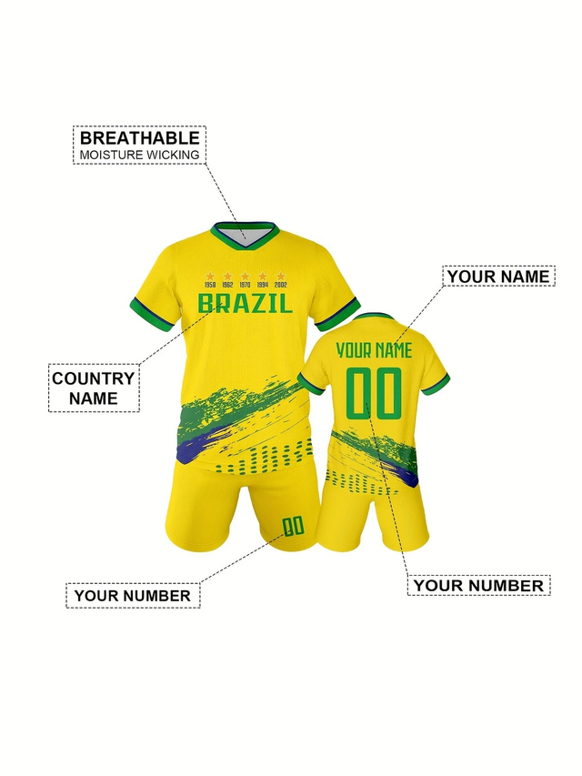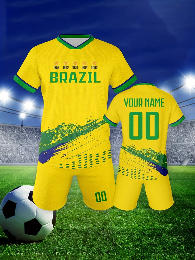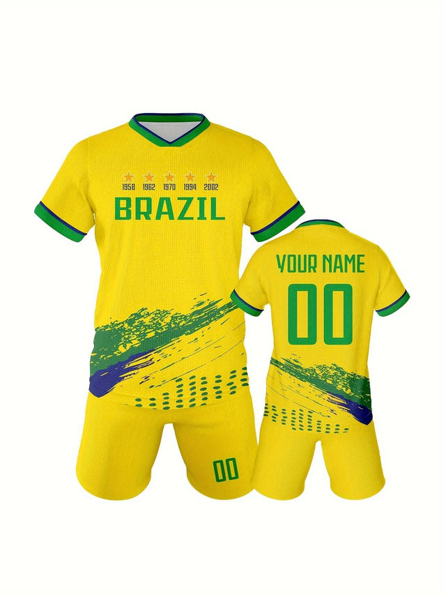 Custom Brazilian National Team Boys' Soccer Jersey & Shorts Set - V-Neck, Breathable Polyester, Perfect for Training & Sports Fans Gift, Perfect for Outdoor