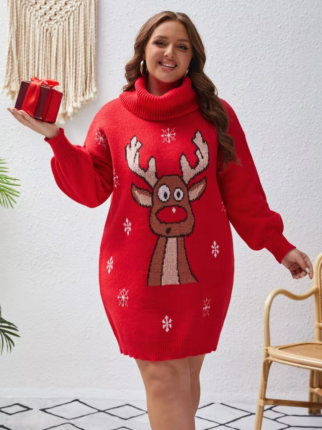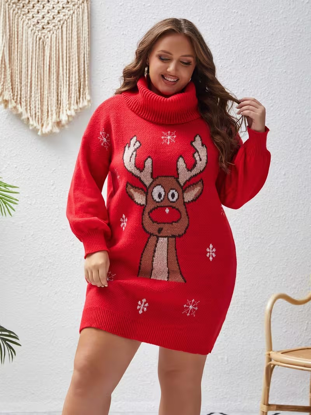 [Christmas] Plus Size Christmas Reindeer Pattern Turtleneck Sweater Dress | 100% Polyester Knit Fabric | Wide Collar Slight Stretch | Casual Vacation Style | Fall/Winter Long Sleeve Knitted Pullover Dress