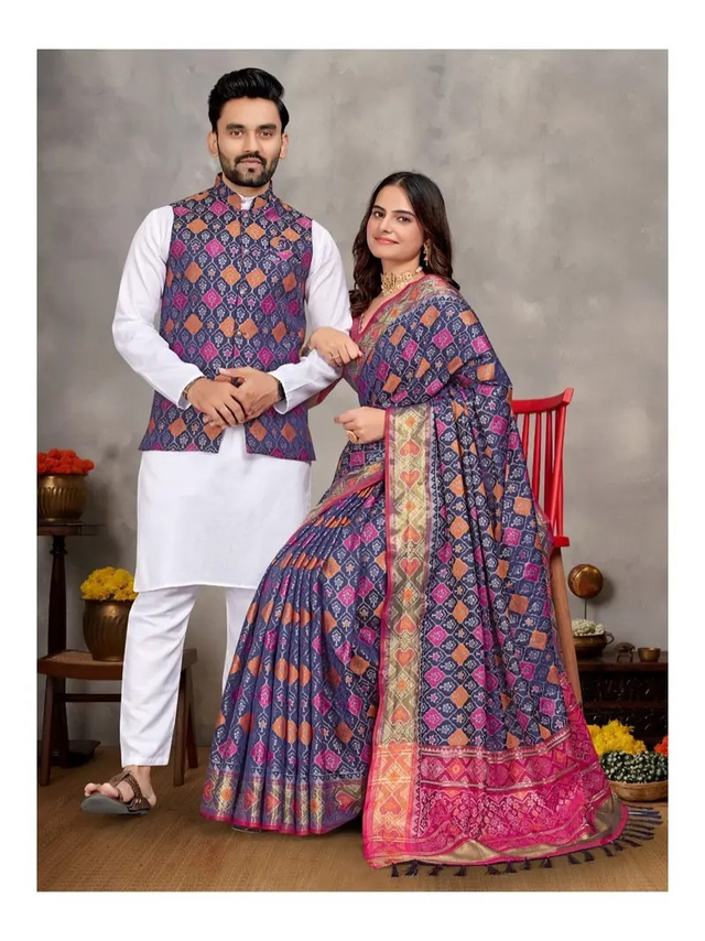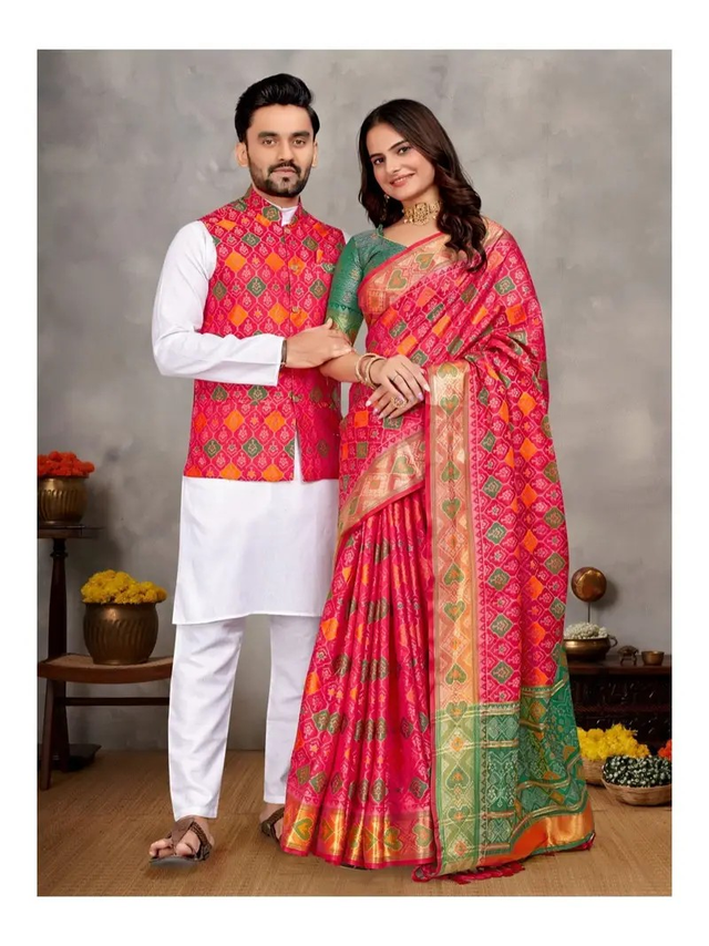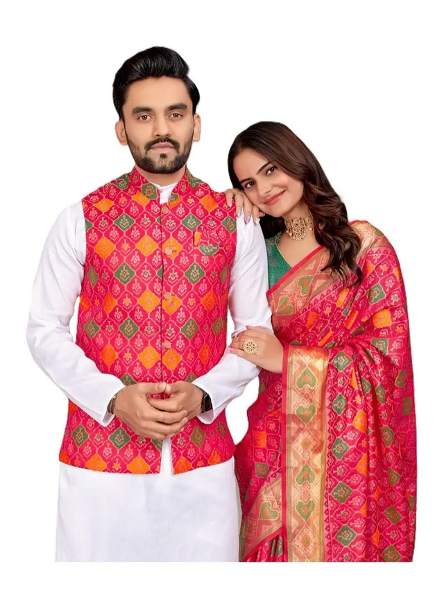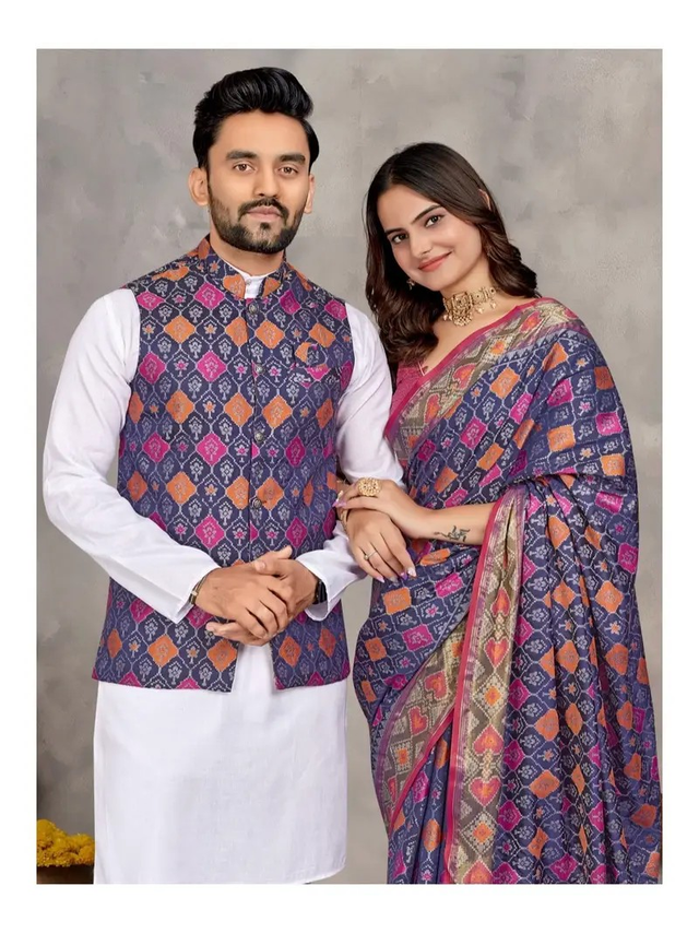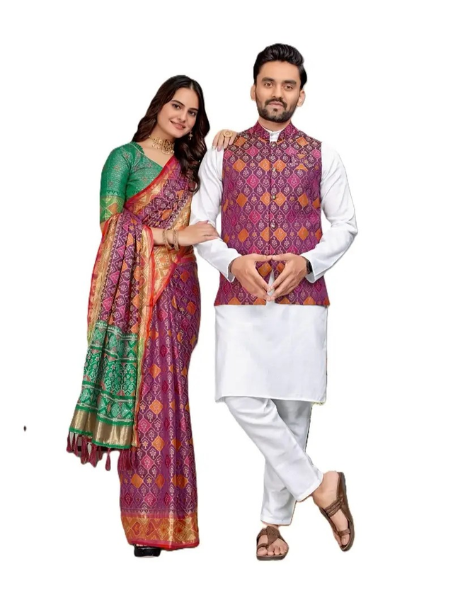 Estationeryhouse Couples Combo Set, Silk Saree with Unstiched Blouse, White Cotton Kurta Pyjama, Silk Waist Coat
