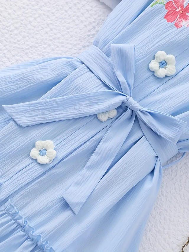 Dress, Elegant Blue Floral Embroidered Dress with Puff Sleeves & Bow Waist