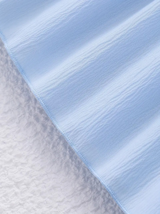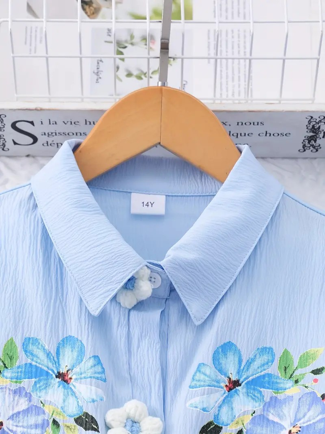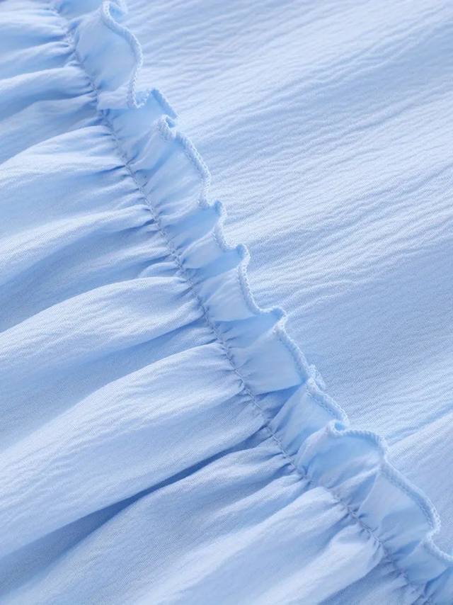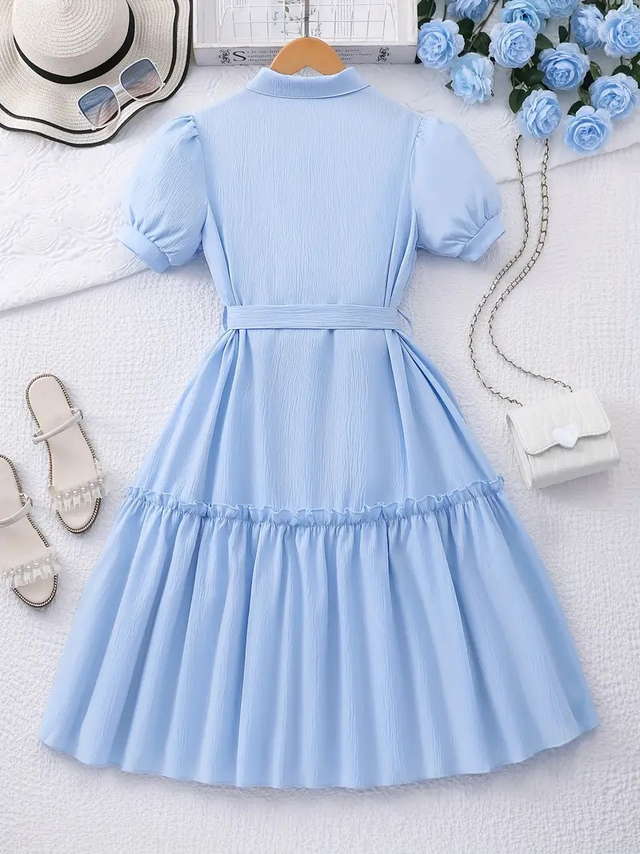 Elegant Blue Floral Embroidered Dress with Puff Sleeves & Bow Waist - Knee-Length A-Line Skirt, Layered Ruffle Hem, Short Sleeve Summer Dress for Teens, Perfect for Casual or Formal Occasions, Cute Dresses, Teenage Fashion, Sophisticated Style, Nonstretch Fabric, For Teenager