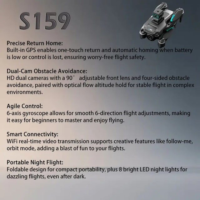 New S159 Long-Endurance Brushless Foldable Drone, 5.9-inch Display Remote Control, GPS Auto Return, Dual Camera with ESC, Intelligent Tracking, Optical Flow Altitude Hold, Infrared Obstacle Avoidance, Sleek Black Design, Easy to Operate, High-Quality Aerial Photography Drone, Perfect Gift for Beginners and Enthusiasts, High Quality Drone