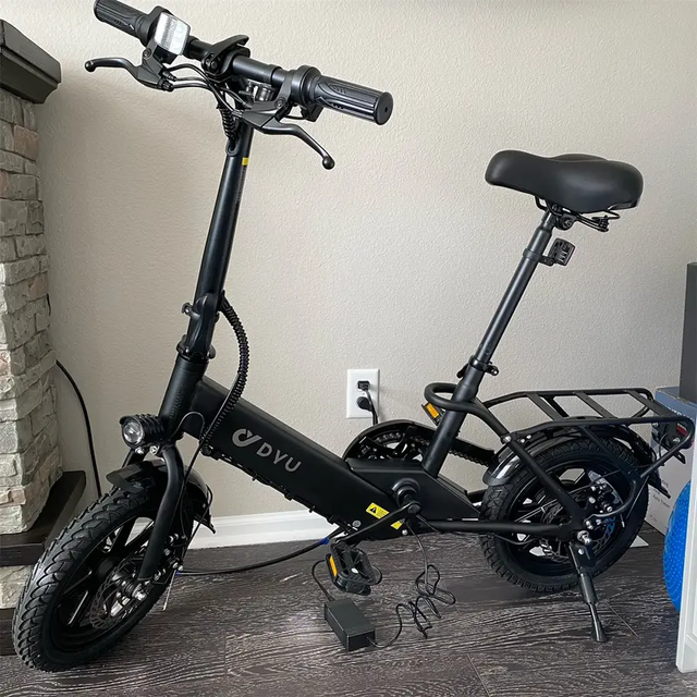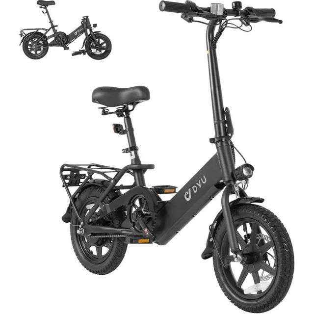 2025 NEW DYU Foldable Electric Bike, 14-Inch City E-Bike with Rear Rack, 36V 7.5Ah Battery, 250W Motor, 3 Riding Modes, Pedal Assist, Dual Disc Brakes, Night Lights, and Shock Absorber, Compact Design for Unisex Adults