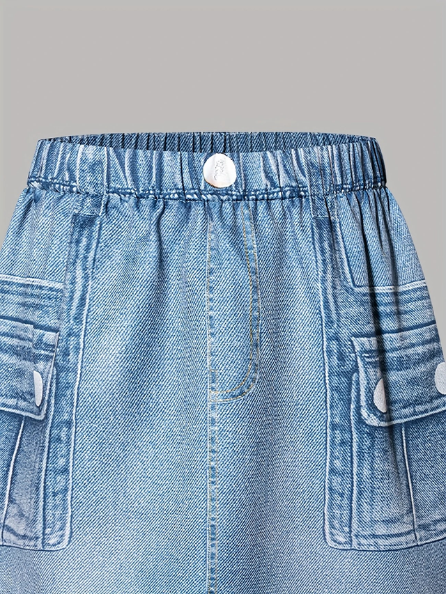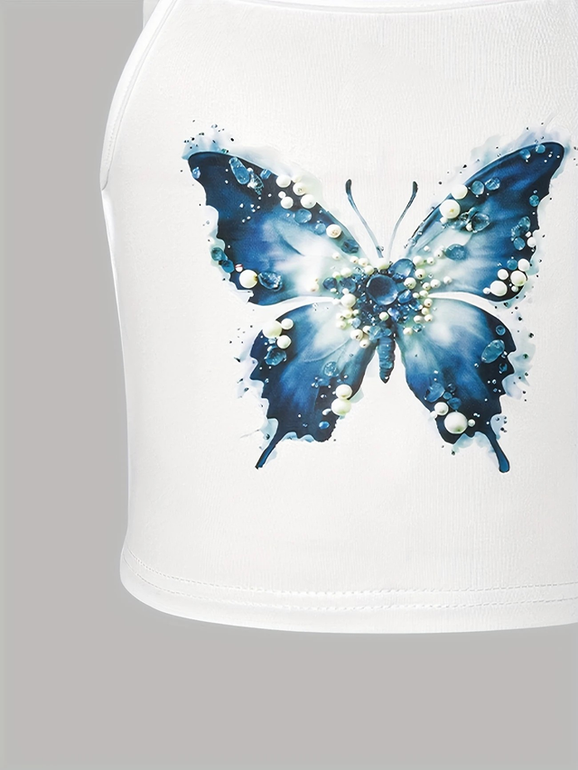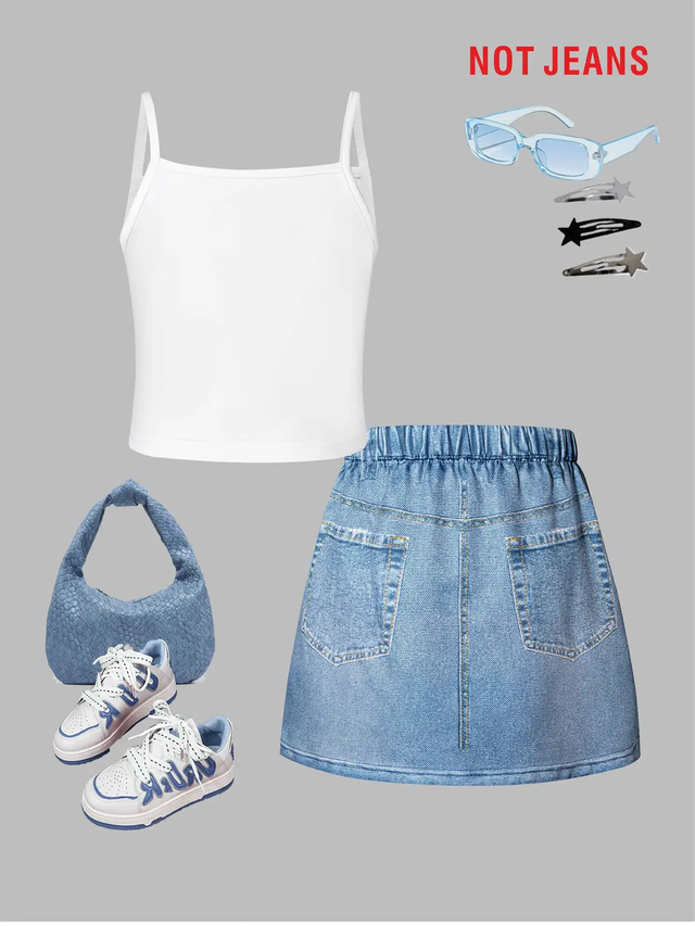 2pcs Summer Girls' Fashion Casual Outfit, 3D Butterfly Print Camisole Top + 3D Imitation Denim Skirt, Machine Washable, Regular Fit with Faux Pockets, Perfect for Holiday Leisure; Stylish Girl's Clothing, Perfect for Outdoor