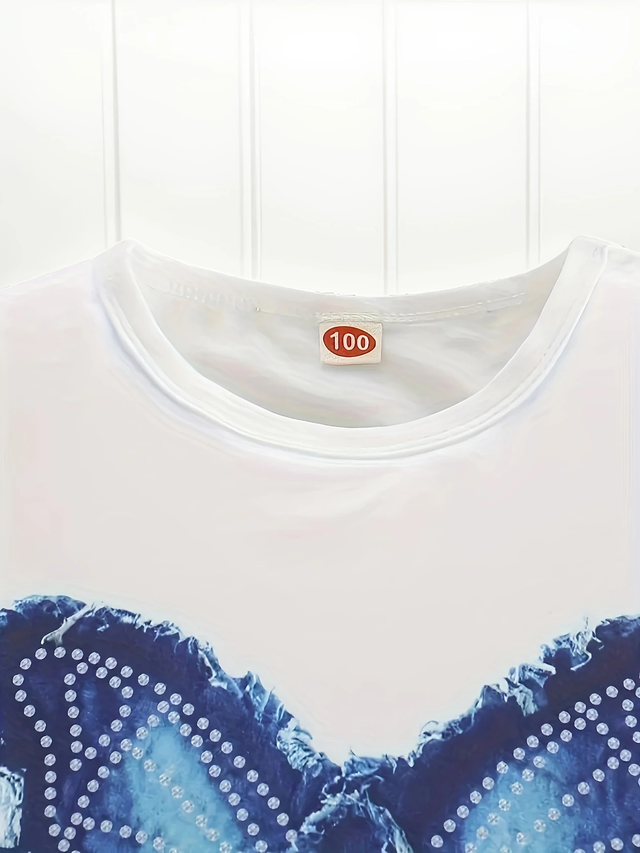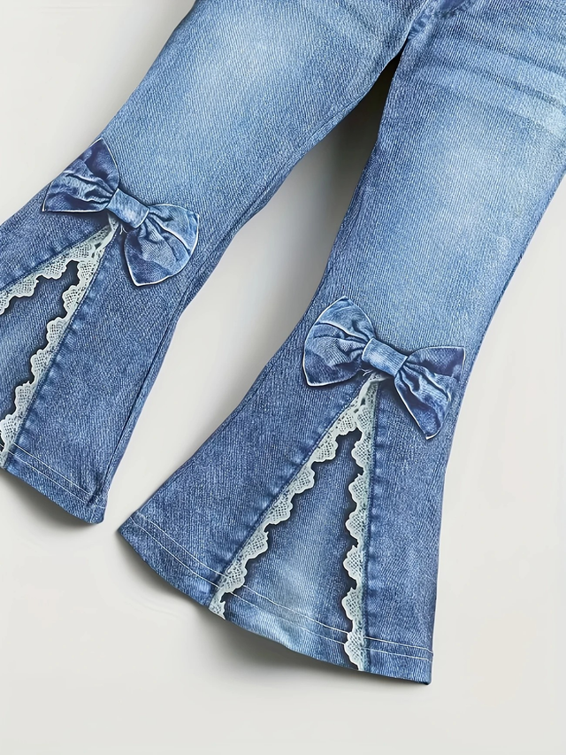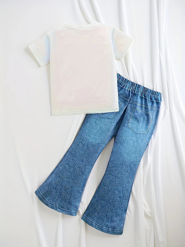 Girls 2pcs Pantsuit, Casual Polyester Short Sleeve Top with Butterfly Print and Imitation Denim Pants