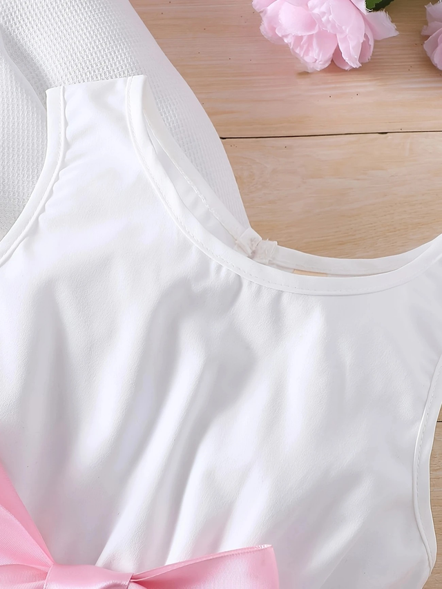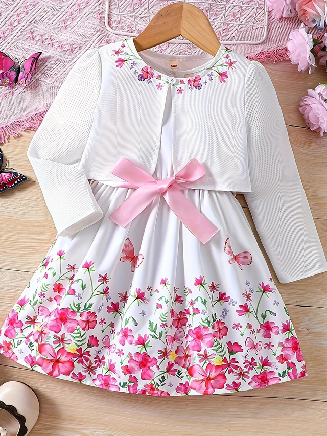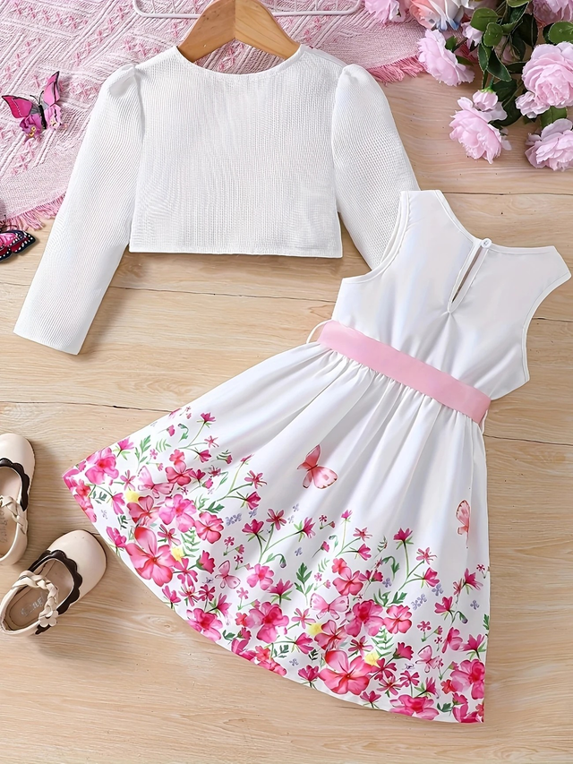 2pcs set of girls' elegant and charming floral butterfly print sleeveless round neck dress with belt + sweet floral print solid color jacket suit, as a gift for holiday parties, suitable for gatherings/parties/evenings/outdoors/casual/daily wear, perfect choice in spring, summer and autumn