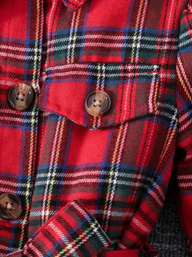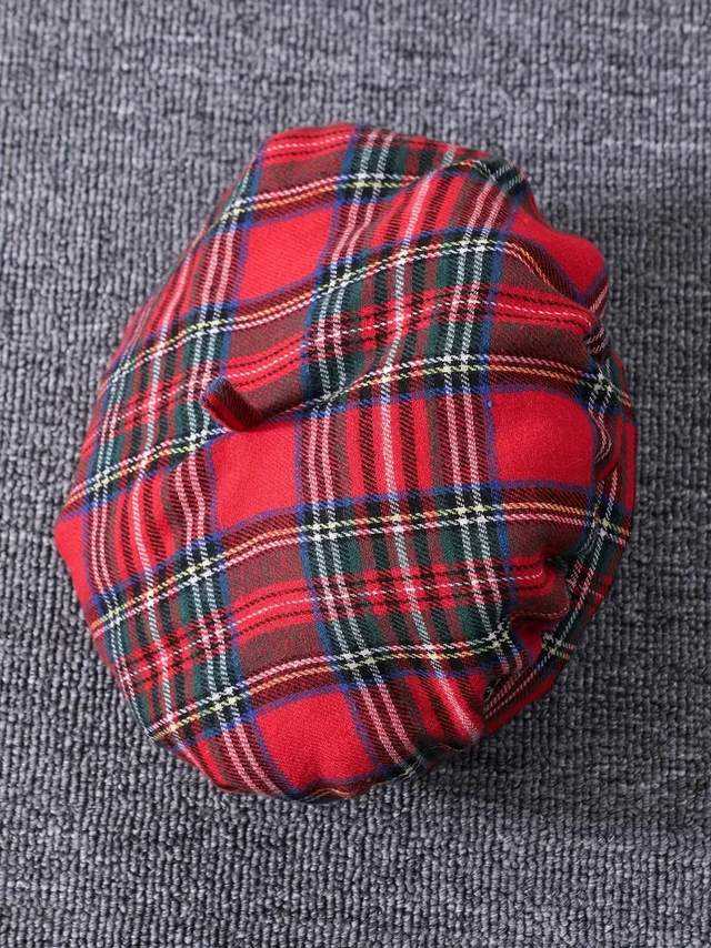 A British-style girl plcheck dress set, Christme-colored autumn and winter long-sleeved lapel + puffed sleeves, sweet and playful knee-length dress, with a matching beret and belt as a gift