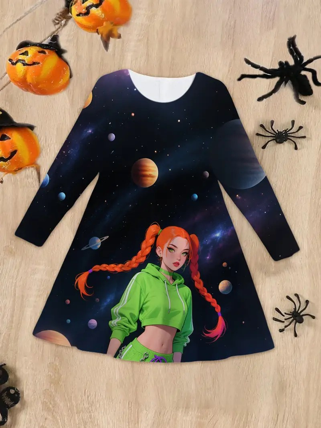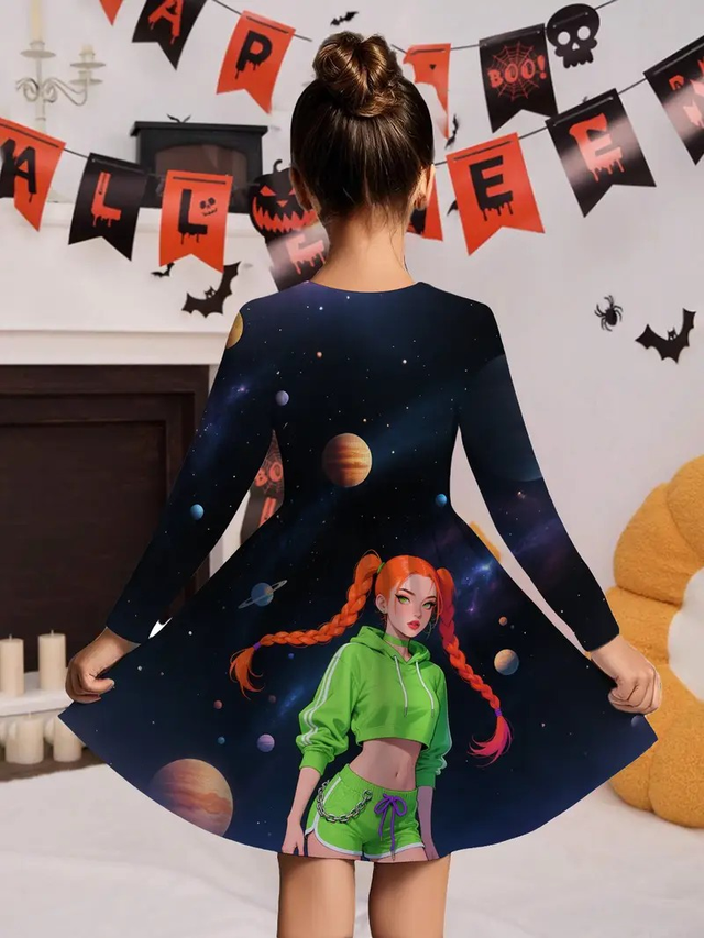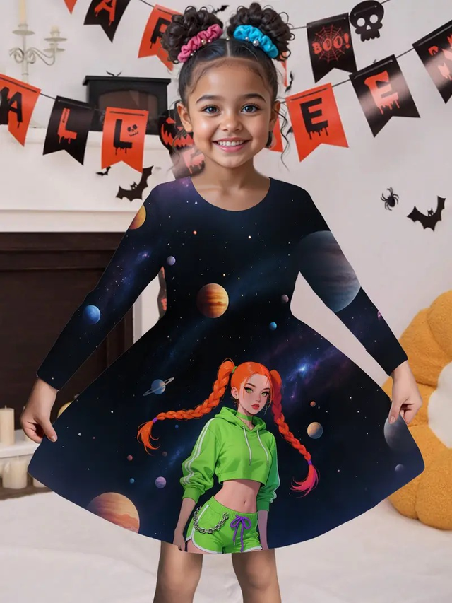 Girls' Halloween Party Dress - Space-Themed with Planets & Stars, Long Formal or Everyday Outfit for Halloween, Birthday, School - Easy-to-Wear Girls Clothing for Fall & Winter Celebrations, Halloween Clothes, Festive Kids Attire, Playful Kids Design, Medium Elasticity Fabric, Durable Kids Wear, Comfortable Fit, School Celebration, Cartoon Print, Stretchy Material, Kids Fashion, Girl Dress Age, Girl Dress, Dress For Girl Autumn, Dress For Girl, Girl Party Dress, Princess Dress