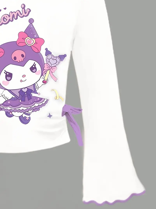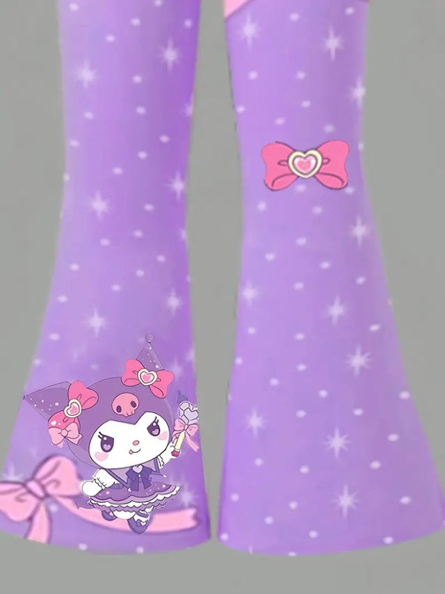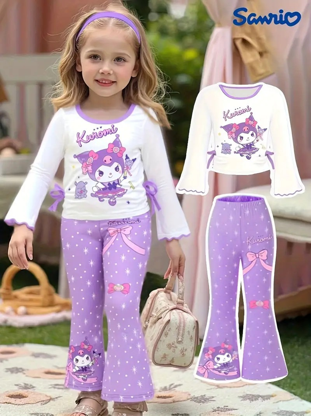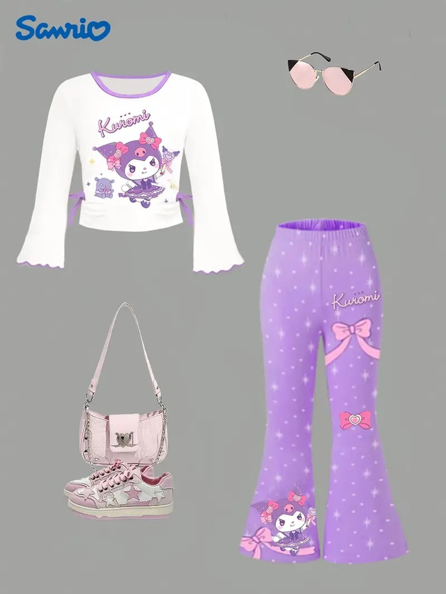 [Sanrio Two-Piece Set] Sanrio Two-Piece Set | Short-Sleeve Round Neck T-Shirt with Bow And Fitted Flared Pants for Outdoor