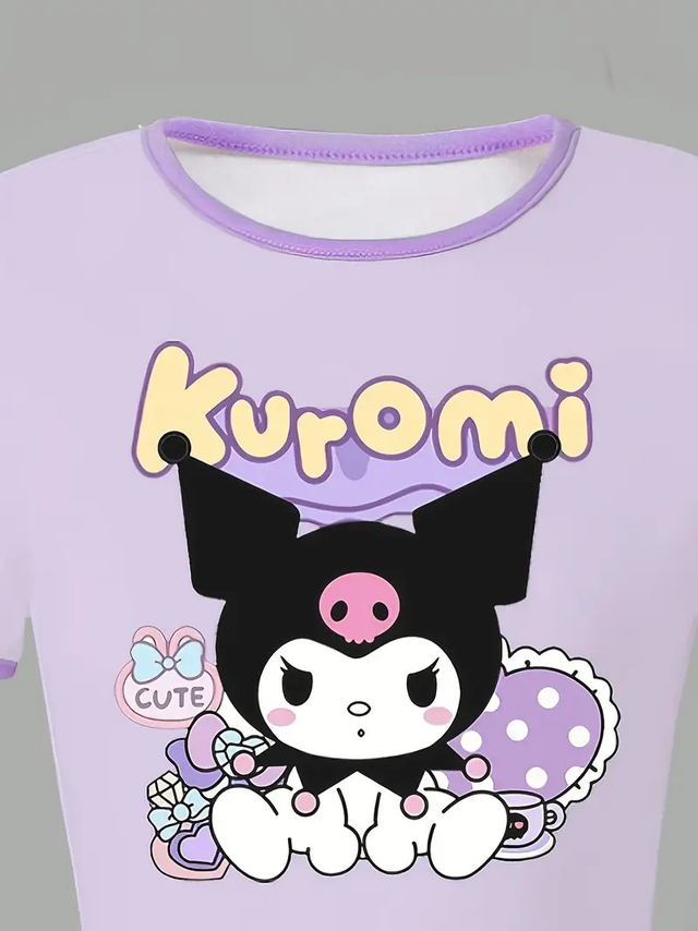 Sanrio Ku'luo'm Girls' Short Bow Tie Round Neck T-Shirt + Slim Fit Flared Pants Two-Piece Set, for Outdoor