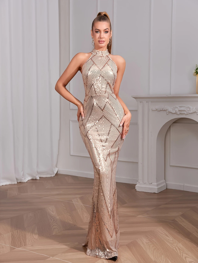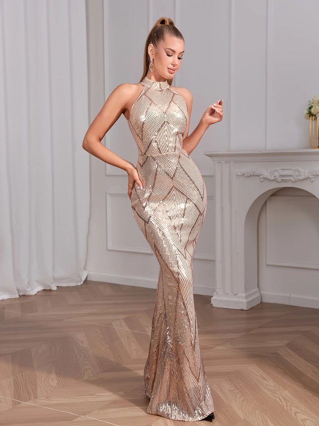 Elegant Champagne Sequin Embroidered Mesh Gown for Women - Sleeveless, Stretchy, Long Mermaid Tail Dress with Stand Collar & Geometric Pattern, Perfect for Parties and Banquets