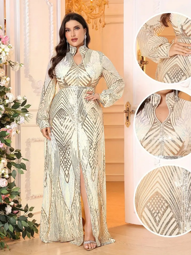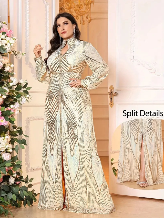 Plus Size - Elegant Plus Size Long Sleeve A-Line Evening Gown with High Slit - Golden Sequin V-Neck Dress for Parties, Galas, and Formal Events, Formal Evening Gown