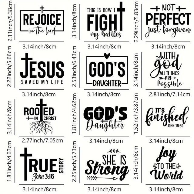 12-Pack Inspirational Christian Phrase Iron-On Transfers, Black Vinyl Decals for DIY Clothing and Fabric, A-Level Washable Heat Transfer Patches for Shirts, Bags, and Textiles