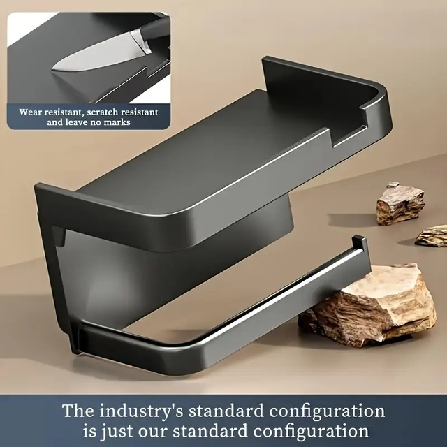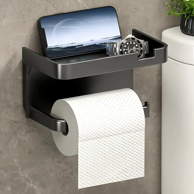Luxury Self-Adhesive Wall-Mounted Bathroom Tissue Holder with Storage Rack – Sleek Black High-Gloss Finish, Multi-Functional Organizer for Toilet Paper, Towels, Smartphone & Watch, Ideal for Home and Hotel Bathrooms, Bathroom Accessories