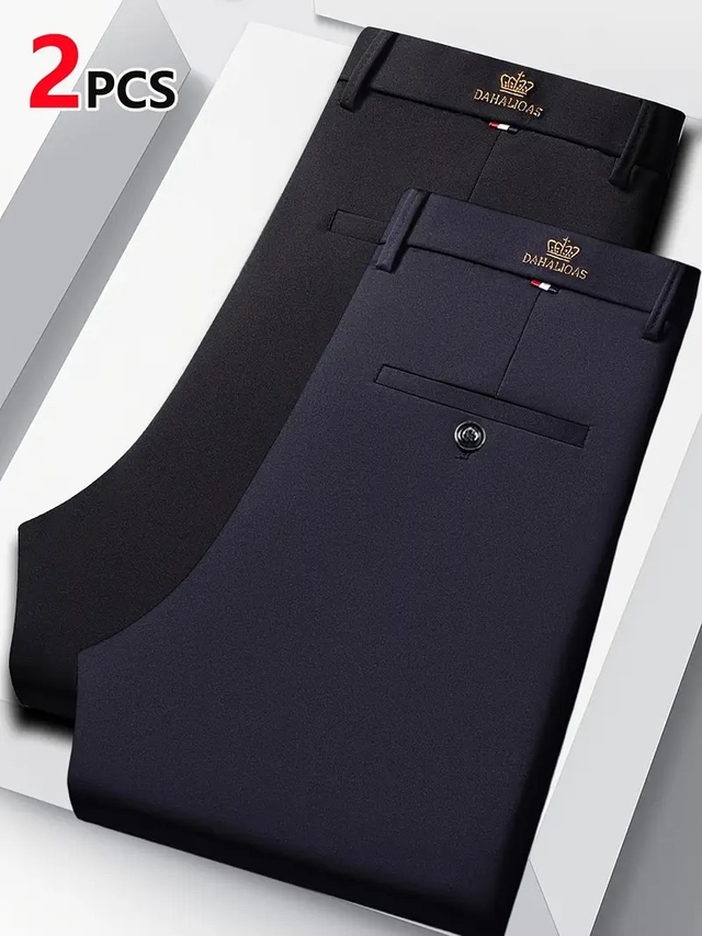 2 Pairs of Men'S High Stretch Wrinkle-Resistant Straight-Leg Suit Trousers - All-Season Machine Washable Business Casual Trousers with Crown And Dahlia Pattern, High Waist Design, Button Zipper Closure, Professional Fit, Classic Style, Quality Craftsmanship, Fashionable Menswear