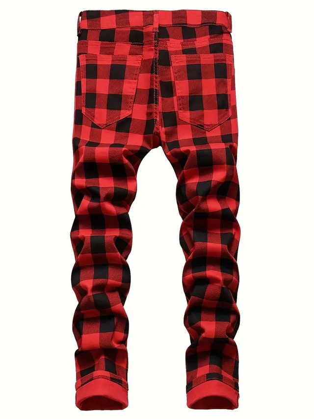 Festive Red & Black Plaid Christmas Jeans for Men - Slim Fit, Stretch Cotton Blend, Comfortable & Durable Denim with Zip Closure - Ideal Holiday Gift, Sizes 30-40