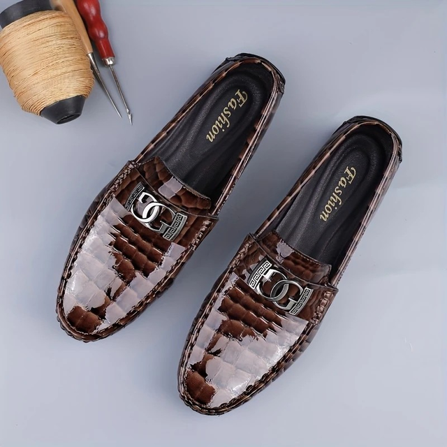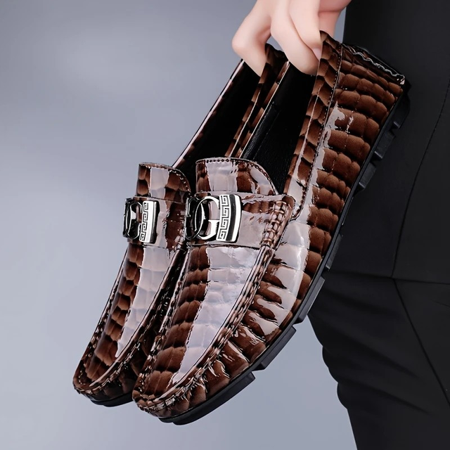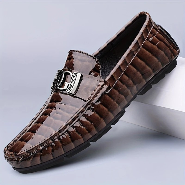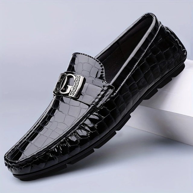 Genuine Driving-Style Loafers for Men - Black Crocodile-Patterned Slip-On Shoes with Metal Buckle, Comfortable Rubber Sole, Low-Top Design, Perfect for Casual Attire
