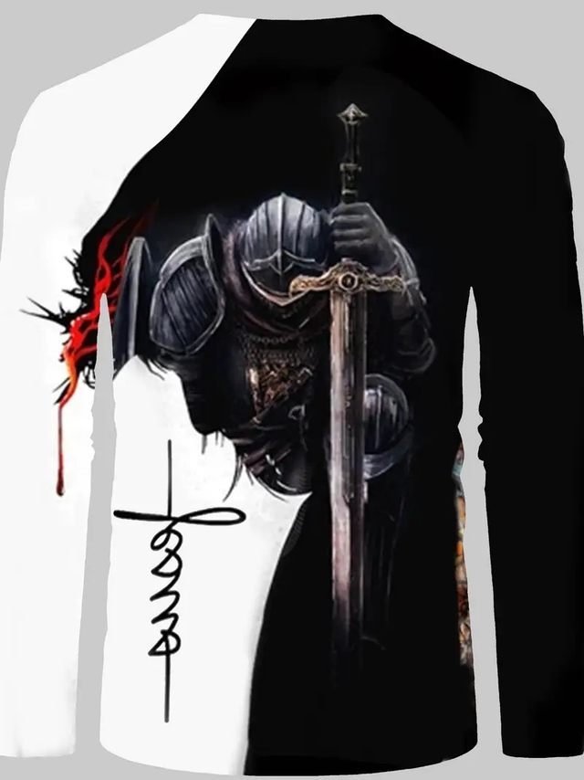 Men's 3D Graphic Long Sleeve Shirt - Knight Armor & Jesus Design, Contrast Black/White Sleeves, Stretch Fabric, Machine Washable, Spring/Fall Casual Wear, Spring Autumn Top, Edgy Casualwear, Nontransparent Material