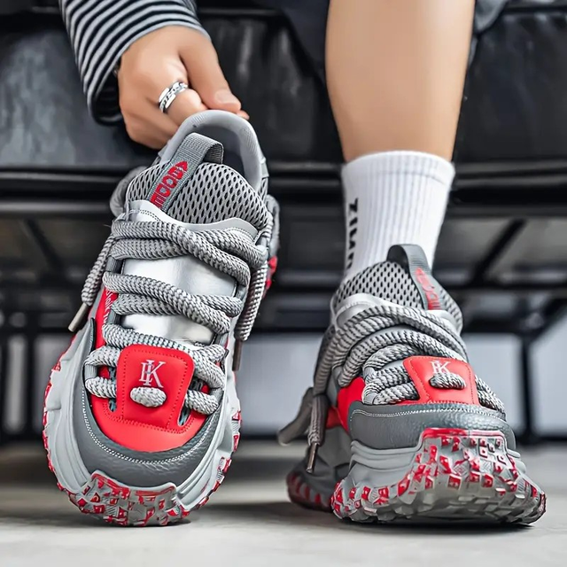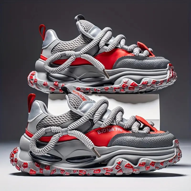 Men'S Breathable Mesh Low-Top Sneakers - Trendy Thick Sole Casual Shoes with Lace-Up Closure, Grey & Red Accents for Casual Attire, Parties, and Camping, Party Footwear, Stylish Laceup Shoes, Durable PVC Sole