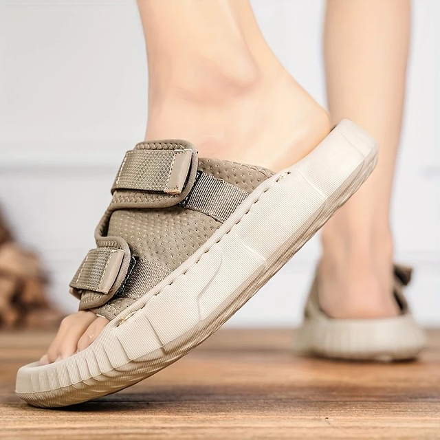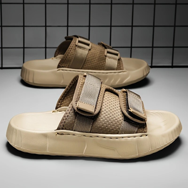 Men's Breathable Summer Slide Sandals - Lightweight, Non-Slip EVA Sole, Open Toe, Slip-On Beach & Casual Shoes in Beige with Adjustable Buckle Straps and Textured Grip Design