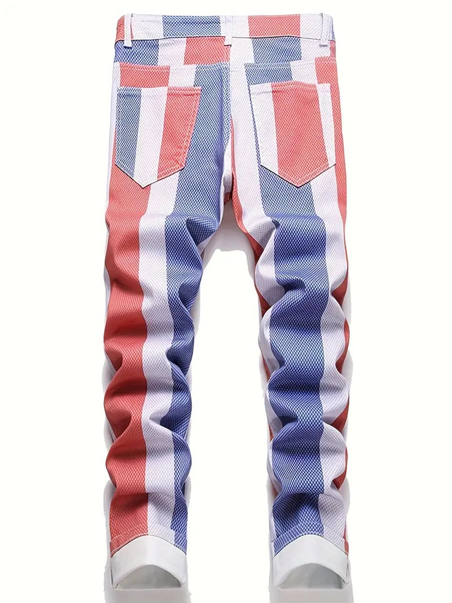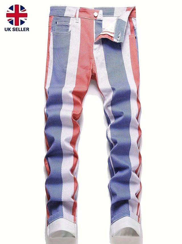 Men's British Flag Jeans - Stretch Skinny Pants with Red/Blue Stripe, Slim Fit Straight Leg, Stretch Denim for Streetwear, Parties, Everyday - Non-See-Through & Machine Washable