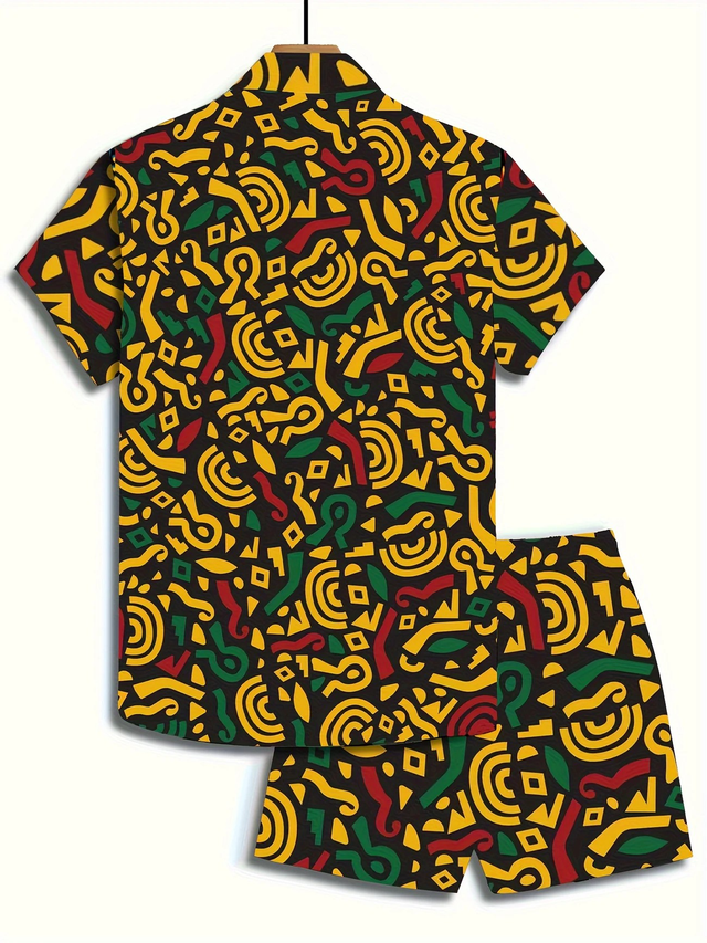 Men's Casual 2-Piece Outfit With Fashion African Element Print, Breathable Comfy Button-Up Shirt & Shorts Set, No T-shirt