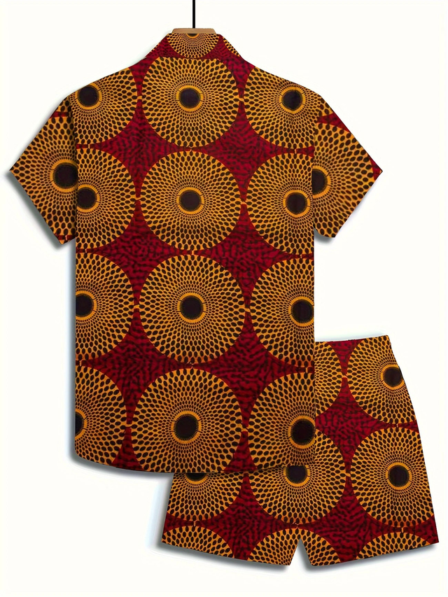 Men's Casual Ethnic Print Button-Up Shirt & Drawstring Shorts Set - Polyester, Machine Washable - Perfect for Summer