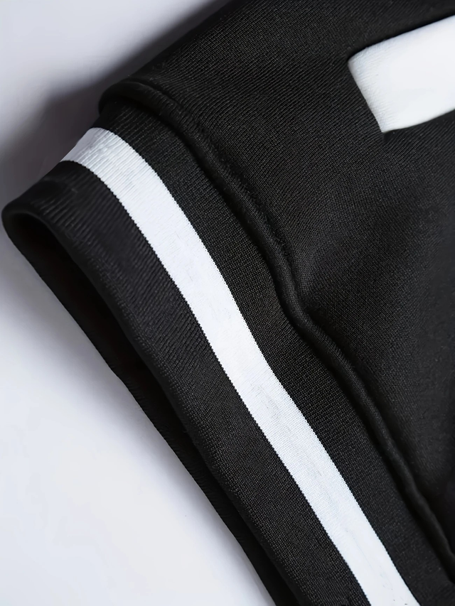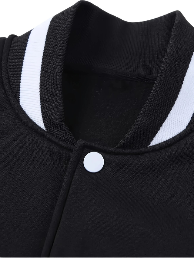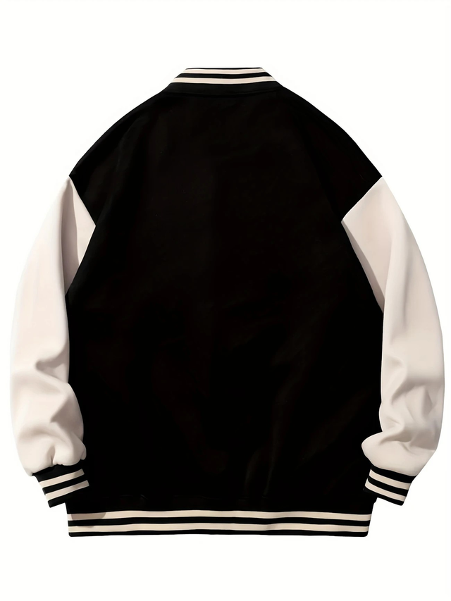 Men's Casual NYC-Inspired Varsity Jacket - Black and Beige, Polyester, Snap Closure, Baseball Collar, Machine Washable, Winter Fashion, PLUS SIZE