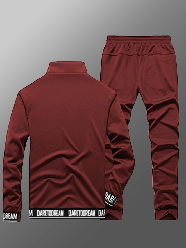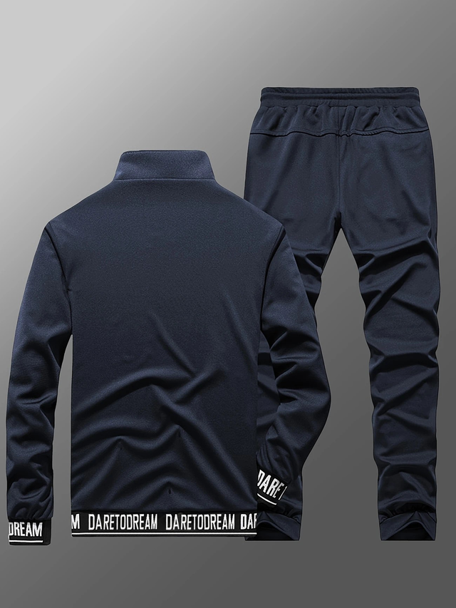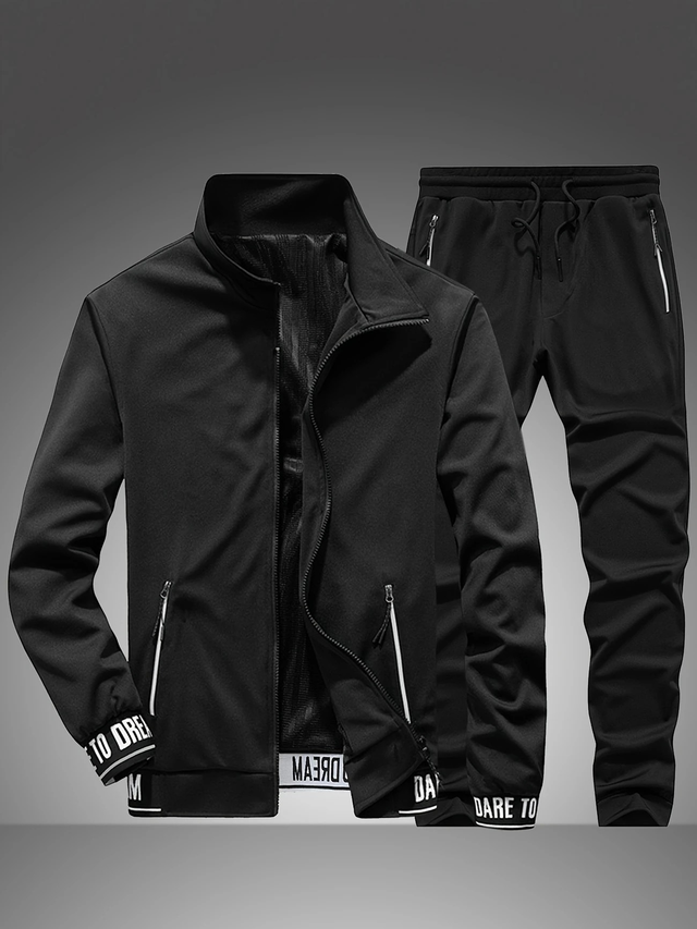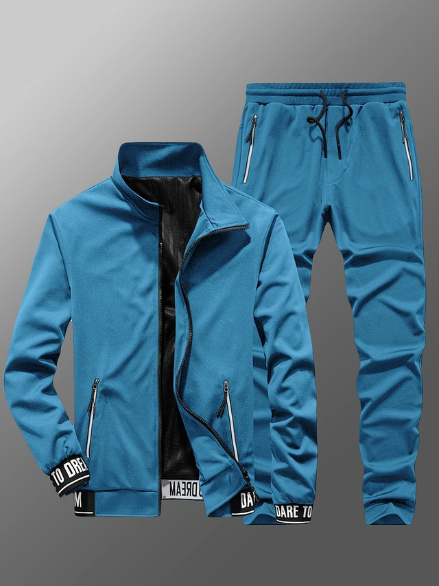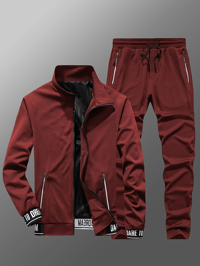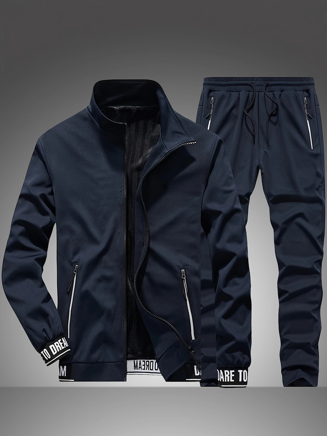 Men's Casual Sportswear Set - Spring/Autumn Fashion Jacket and Joggers, Slightly Stretchy, Solid Color with Pockets