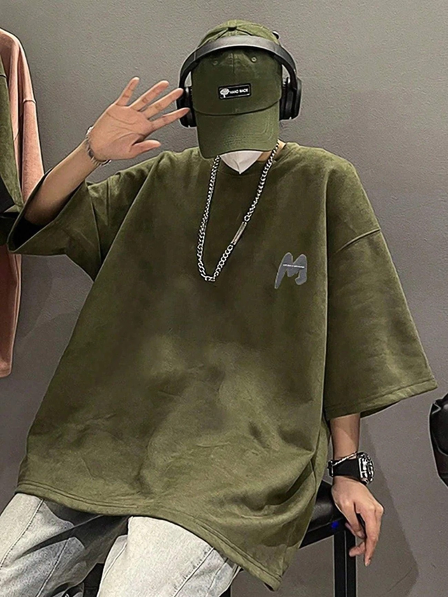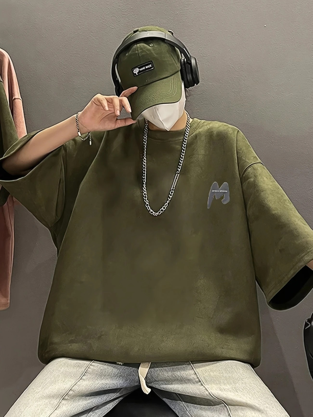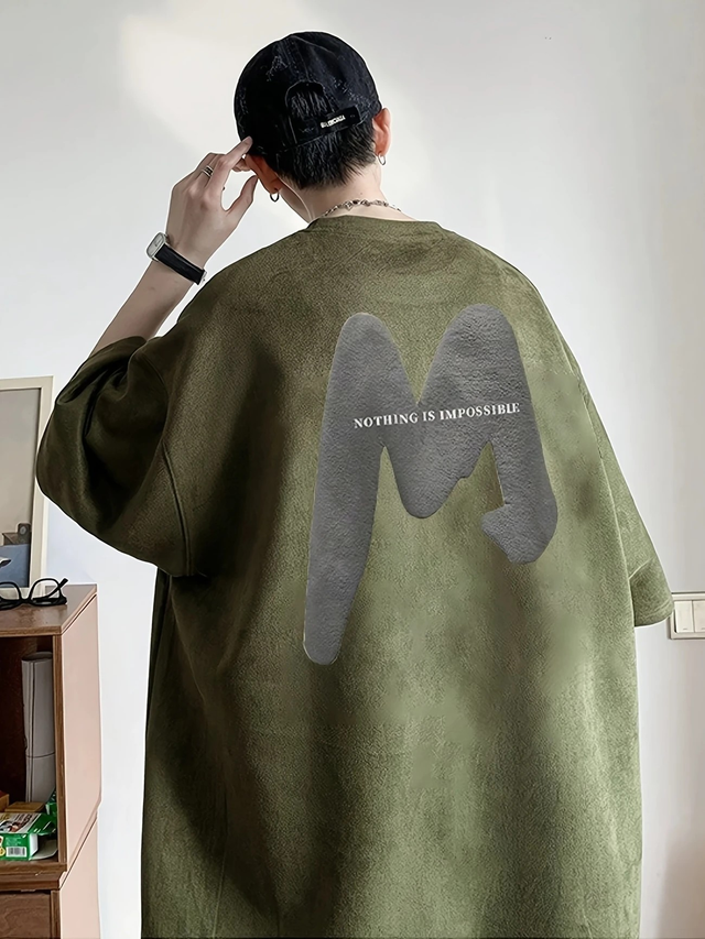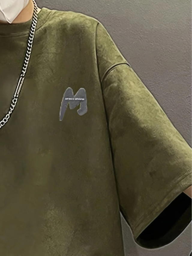 Men's Casual Suedette Suede-Textured Olive Green T-Shirt with Bold Back Letter Print - Drop Shoulder Short Sleeve Round Neck Summer Top, Machine Washable for Casual Attire, Casual Summer Top | Round Neck Tee | Suedette Texture