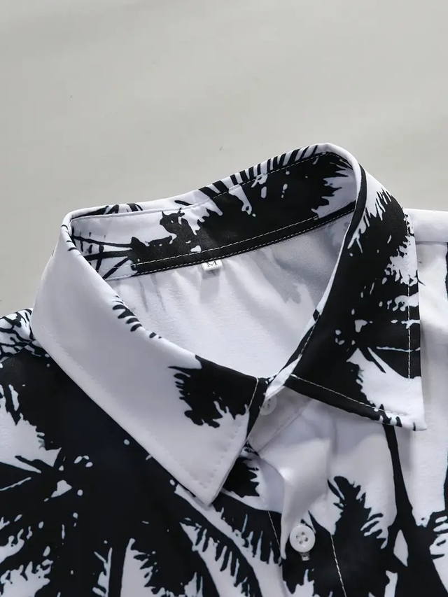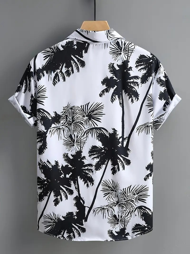 DJINGFC Men's Tropical Palm Tree Print Short Sleeve Shirt - White with Black Coconut Tree Design, Lightweight Polyester, Vacation Style, Button-Up Collar, Machine Washable, Casual Wear | Relaxed Fit Shirt | Lightweight Clothing