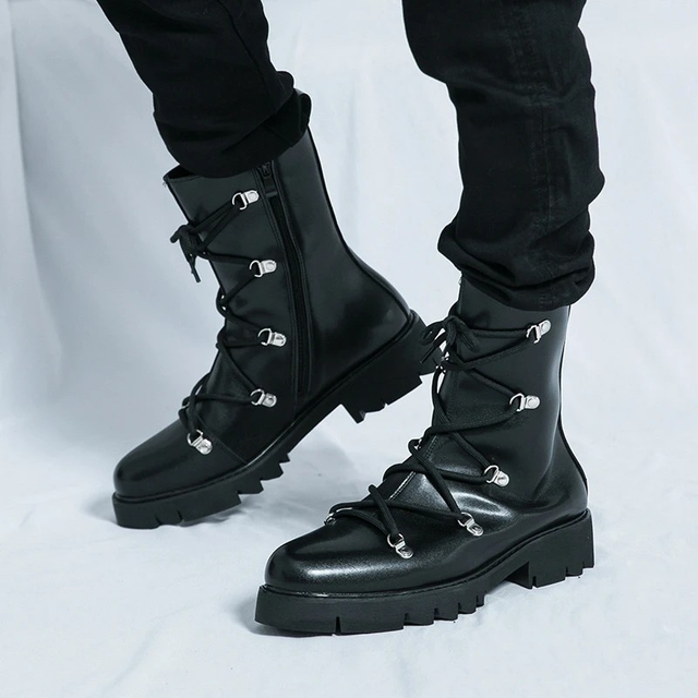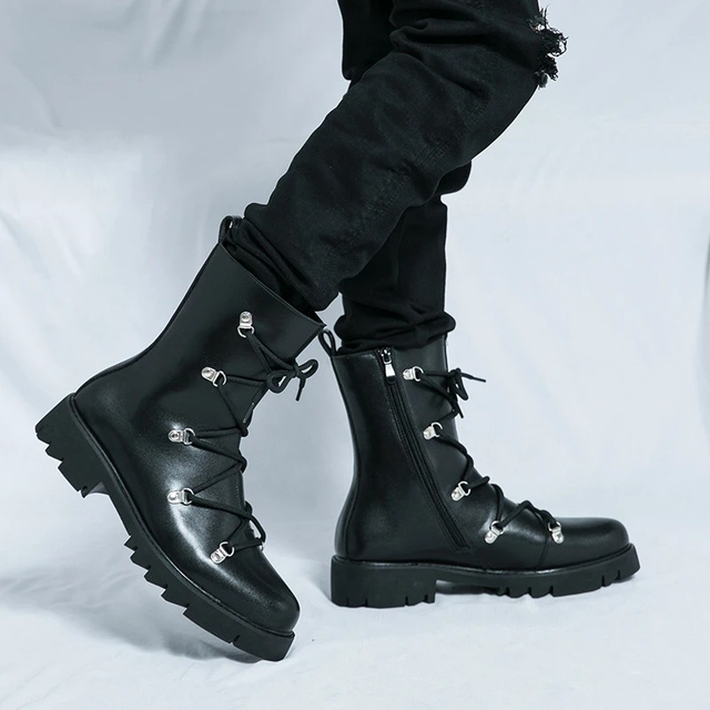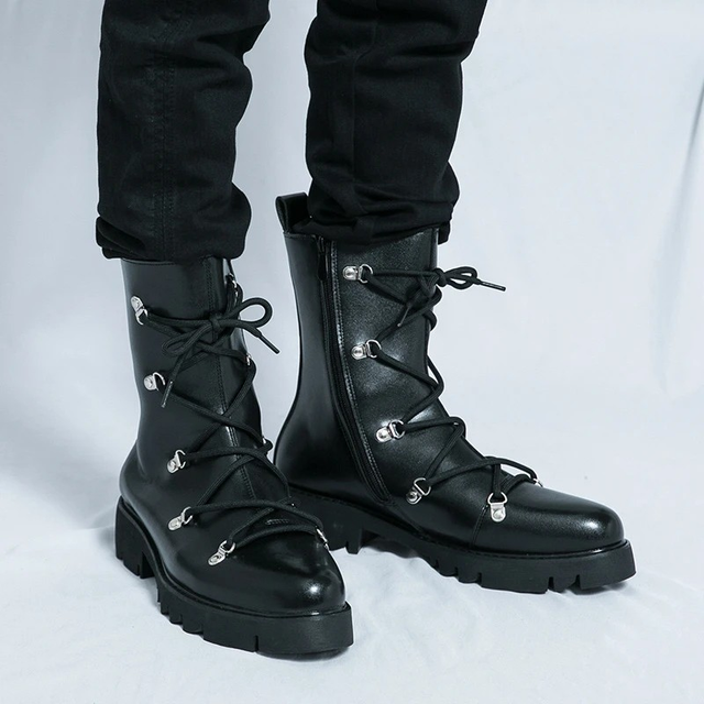 Men'S High-Top Lace-Up Combat Boots - Stylish Black Faux Cover with Chunky Heel, Breathable Design, and Side Zipper Opening for Outdoor, Casual, and Motorcycle Wear, Motorcycle Boots