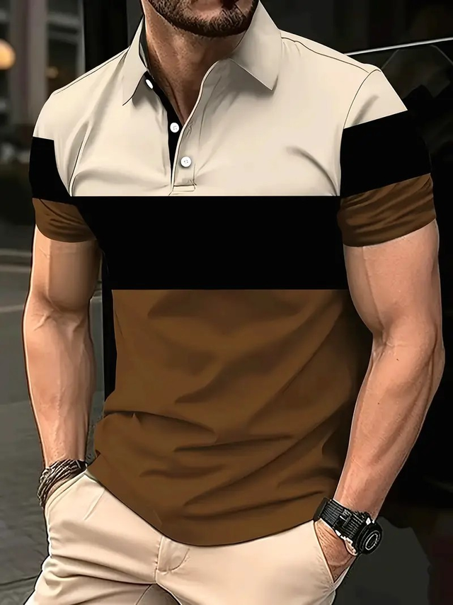 [Polyester Knit Fabric Polo Top] 1pc Men'S Summer Casual Short Sleeve Polo Shirt - Polyester Knit Fabric with Slight Stretch, All Over Print Lapel Collar, Button Detail, Regular Fit - Trendy Multi-Color Short Sleeve Polo Top