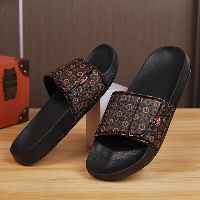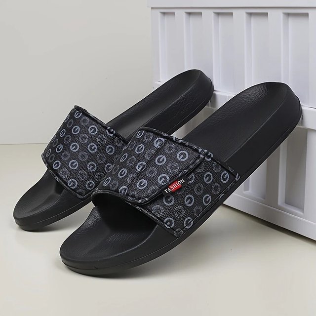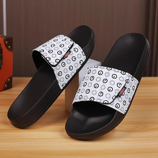 Men's Summer Slide Sandals - Trendy Non-Slip Beach Shoes with Black & White Circular Pattern, Open Toe Design for Outdoor & Casual Wear, Casual Slippers | Monochrome Pattern | Pu Upper Sandals, Summer Sandals
