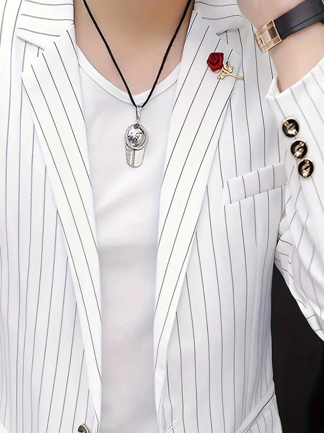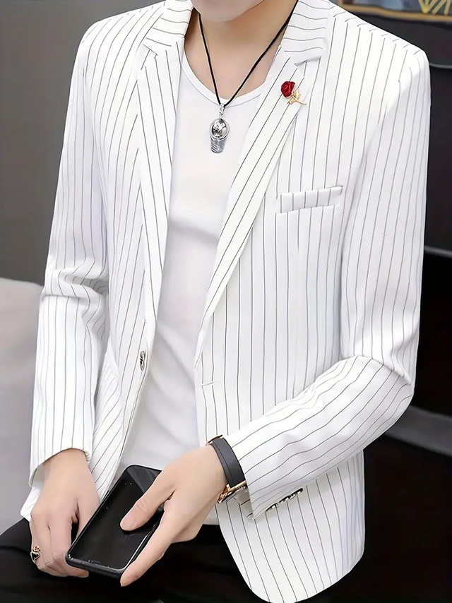Men'S Slim Fit Striped Long-Sleeve Casual Blazer - Stylish Black & White Pinstripe Jacket with Lapel Collar, Non-Stretch Fabric for Spring/Fall, Slim Fit Blazer | Modern Casual Jacket | Chic Desig