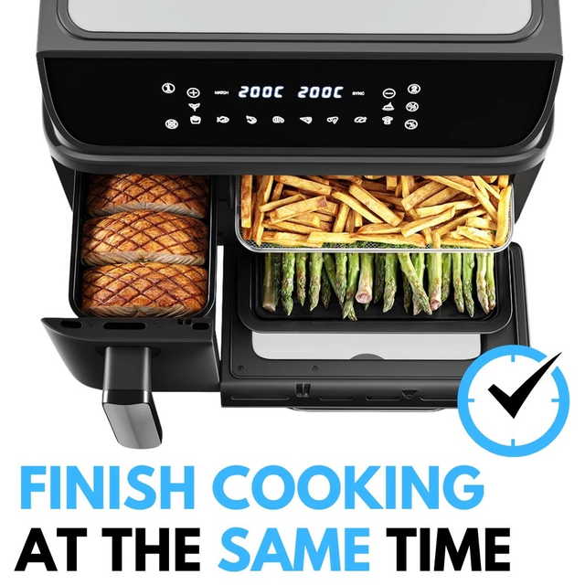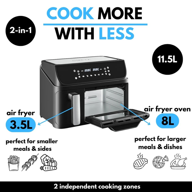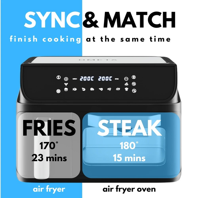 Introducing the Ometa AirCombo air fryers. We have 3 space-saving air fryer Ometa AirCombo models that offer a generous cooking capacity, 10 cooking modes, dual zone cooking and more. The AirCombo air fryers are the perfect cooking appliance for your home! You won’t need anything else. Choose from our 9.5L dual air fryer, 11.5L air fryer & oven combo, or our 12L air fryer oven with interchangeable door for two 5L baskets to make a 10L dual air fryer. Decide on single portion or multiple portion with the generous capacity. The air fryer models come with all accessories you could need to cook up a storm. Each air fryer basket comes with a crisper plate, and the air fryer oven zones come with perfectly fitting trays and racks for optimal use. Use the 10 pre-set cooking settings