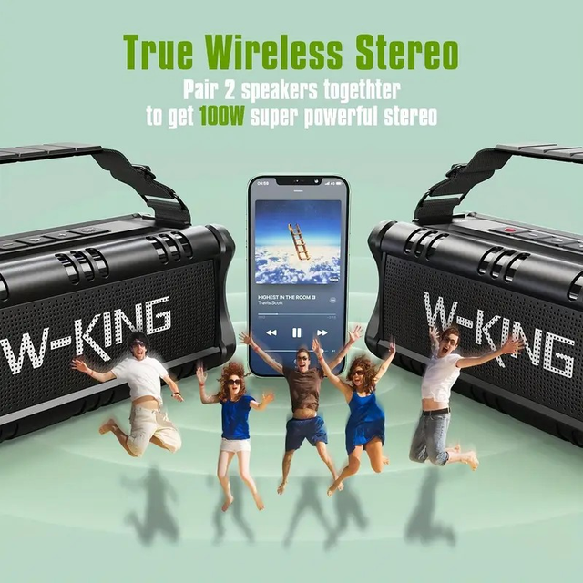 W-KING 70W Wireless Loud Speaker Highly Waterproof Outdoor Portable Subwoofer. It Features High-Fidelity Sound Quality, Powerful Bass, And Loud Stereo Sound. It Supports Dual-Speaker Pairing. with A 5100mAh Rechargeable Battery, It Offers An Extra-Long Battery Life And Can Even Charge Mobile Phones. It Is Suitable for Various Scenarios Such As Daily Desktop Use, In Cars, Camping, And Parties.