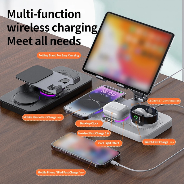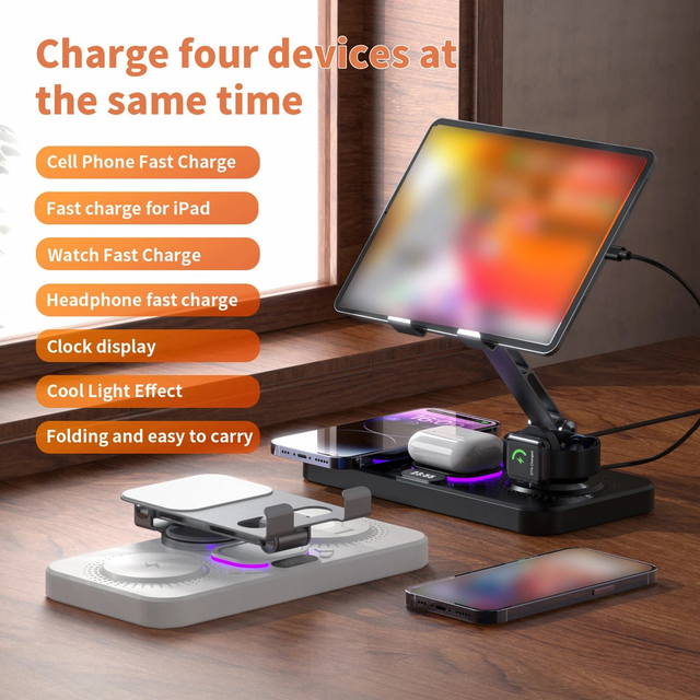 4-in-1 Wireless Charger Station with Phone Holder - Portable Desktop Charger for iPhone 16, 15, 14, 13, 12 Plus, AirPods 4, 3, Pro 2, iPad, and Apple Watch 10, 9, 8, 7, 6, 5, 4 - Fast Charging, USB-C Connector, No Battery Needed, Charging Dock Accessories, Charging Station | Modern Charging Station | Sleek Charging Station