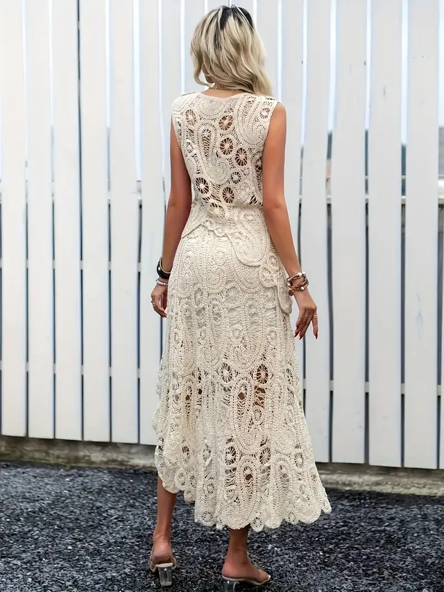 Elegant Lace-Trimmed Sleeveless Top & High-Waist Skirt Set - Chic White Crochet Design, Flowy Maxi Skirt with Side Slit, Perfect for Spring/Summer/Fall, Lace Dress