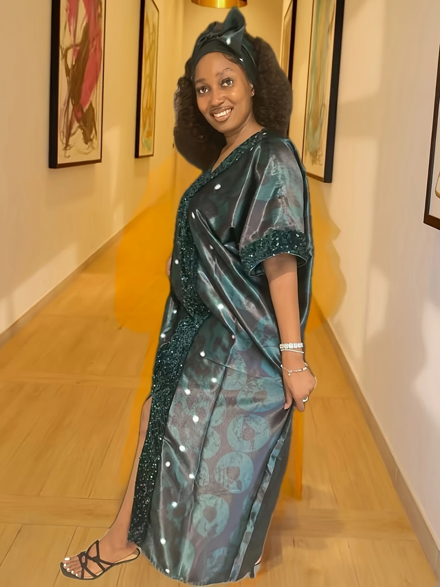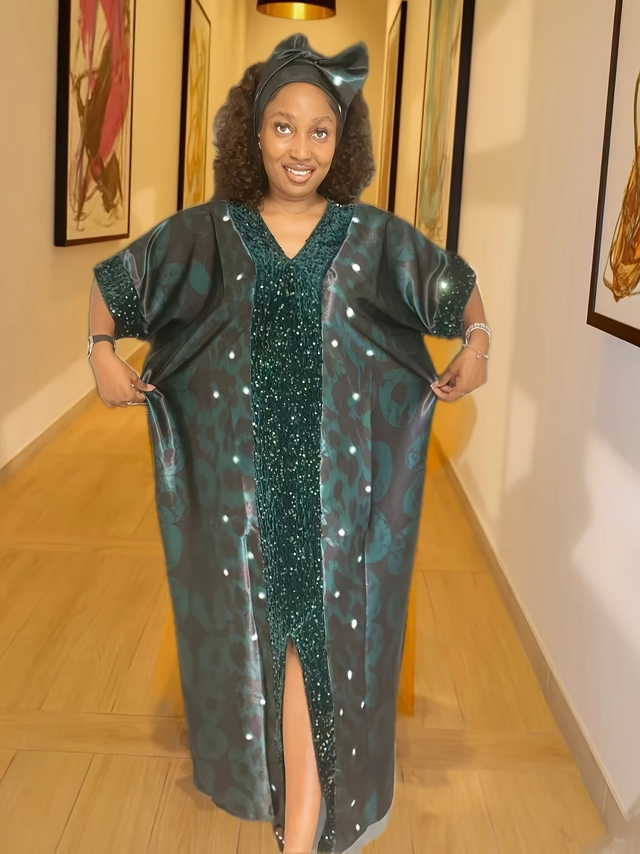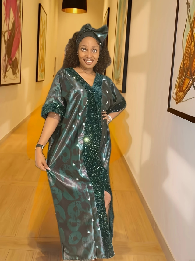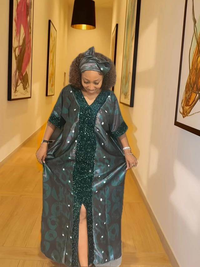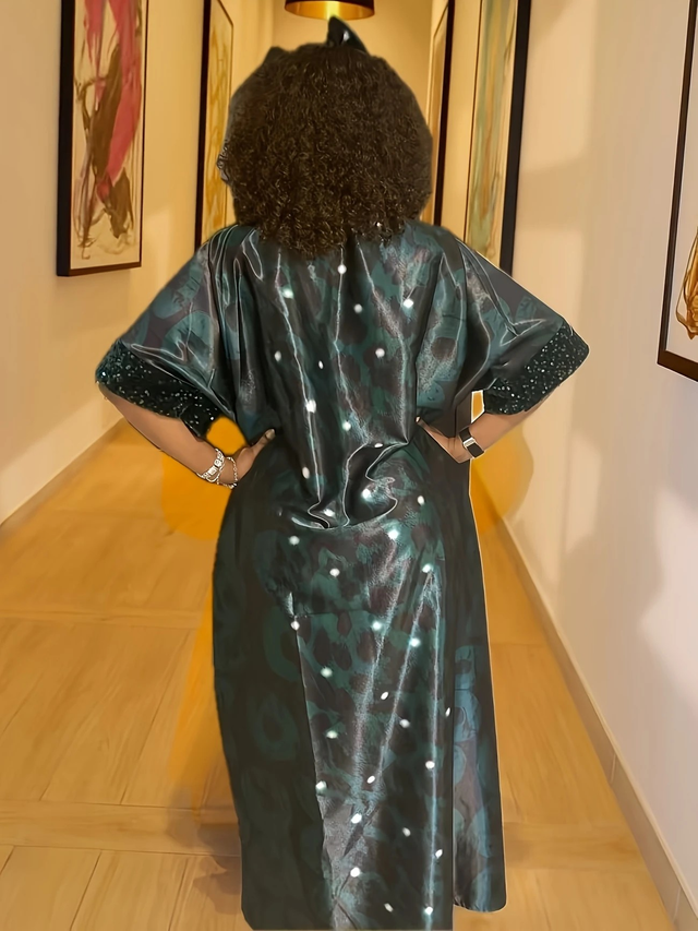 Elegant Sequin-Trim V-Neck Maxi Dress for Women - Short Sleeve, Flowing Design, Dark Blue with Golden Accents, Perfect for Casual or Formal Occasions, Chic Dress, Mature Elegance Attire, Allseason Wear, Nontransparent Fabric, Shimmering Sequins