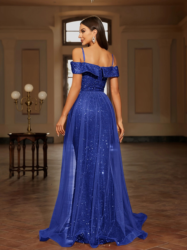 Elegant Off-Shoulder Sequin Mesh Maxi Dress for Women - Long Blue Gown with Sparkling Sequins, Perfect for Parties, Weddings, and Special Occasions, Evening Gown | Elegant Eveningwear | Sparkling Sequin Detailing