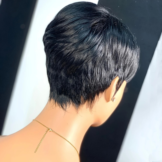 Pixie Cut Wigs For Women Human Hair 1B Short Wig With Bangs Layered Pixie Cut Wigs 9A Brazilian Remy Human Hair Full Machine Made Wig Natural Black Color Haircut Wig Short Glueless Wigs For Women