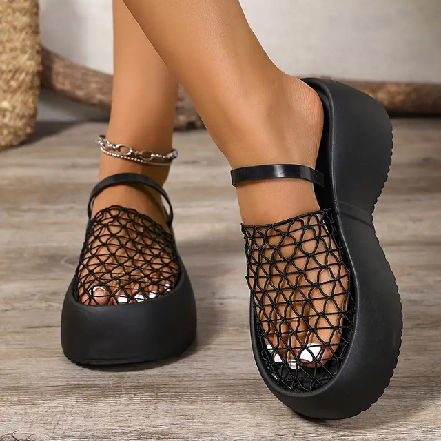 Women'S Casual Platform Sandals - Stylish Black Mesh Fishnet Design with Thick Cushioned Sole, Comfortable Slip-On Round-Toe Shoes for All-Season Wear, Perfect for Casual Attire, Ladies Shoes And Sandals